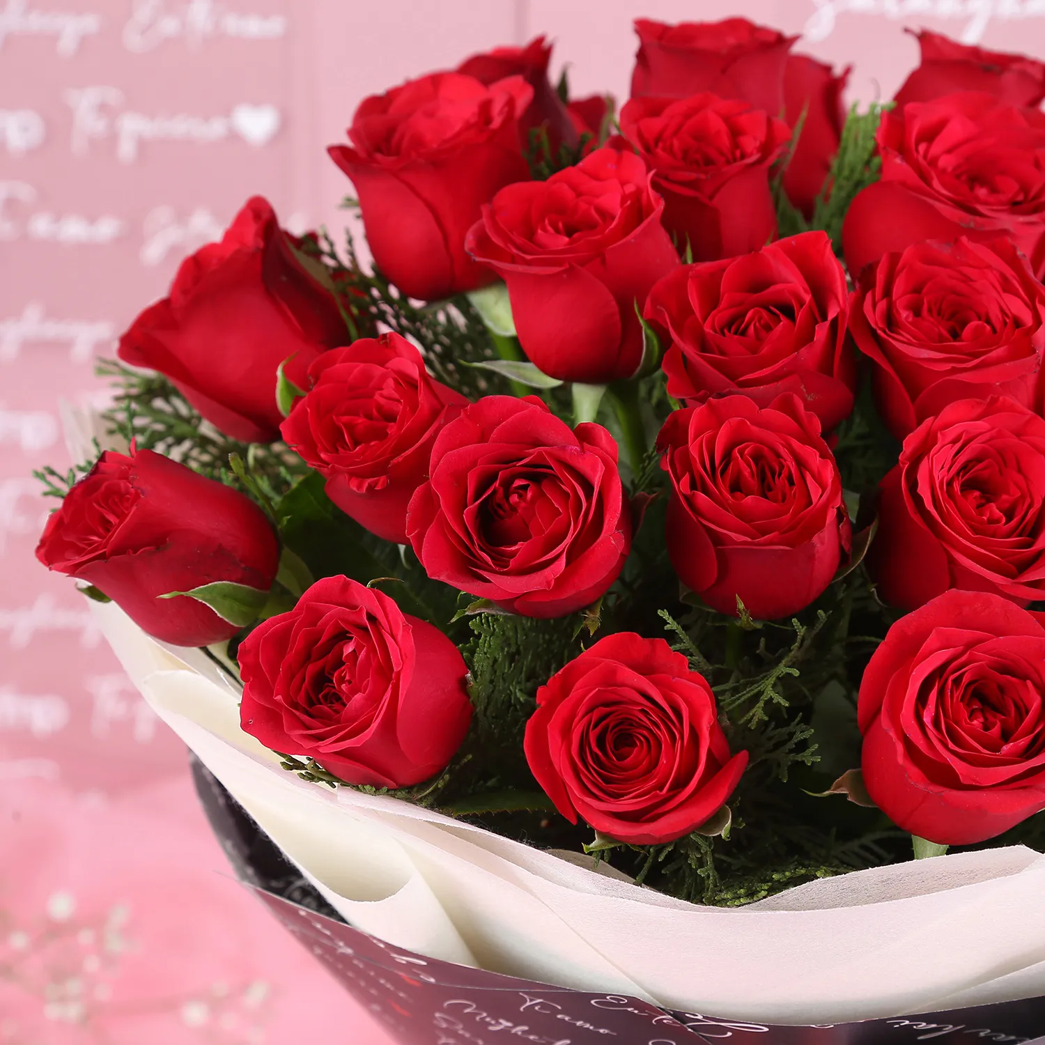 Amaze your special one with this mesmerising bouquet of red roses wrapped in a graceful combination of off-white & black. While the red roses evoke passion, the black brings in the elegance of a fulfilled love. Together, saying 'I Love You' in a manner that's uniquely you.